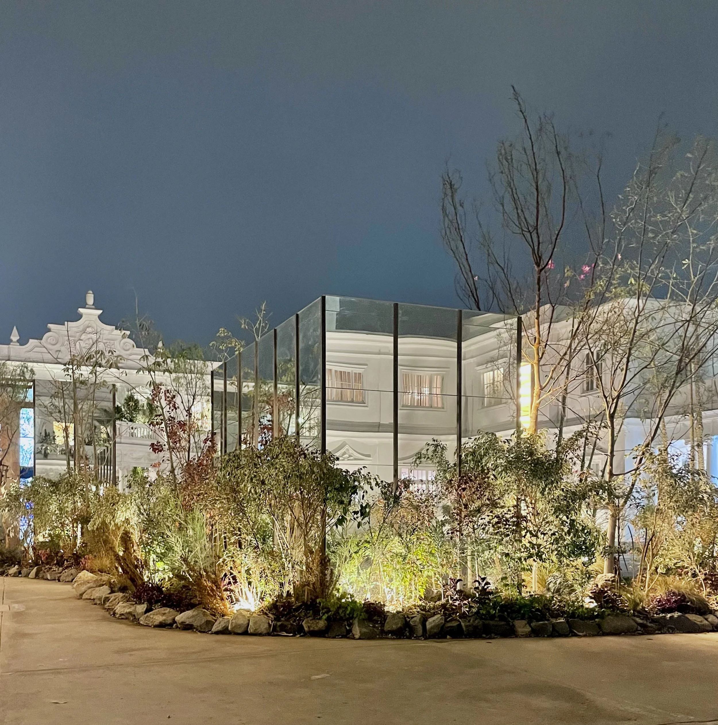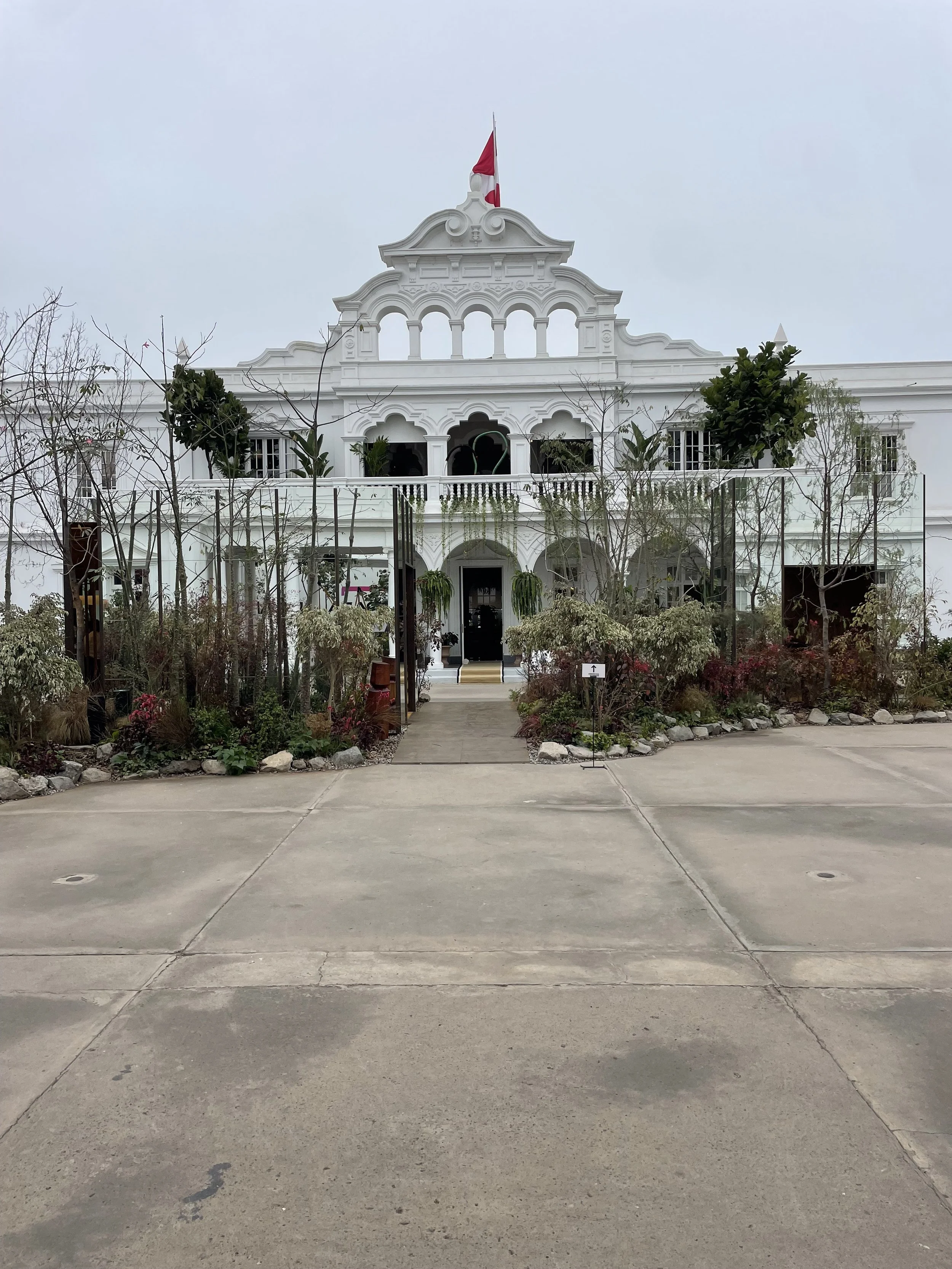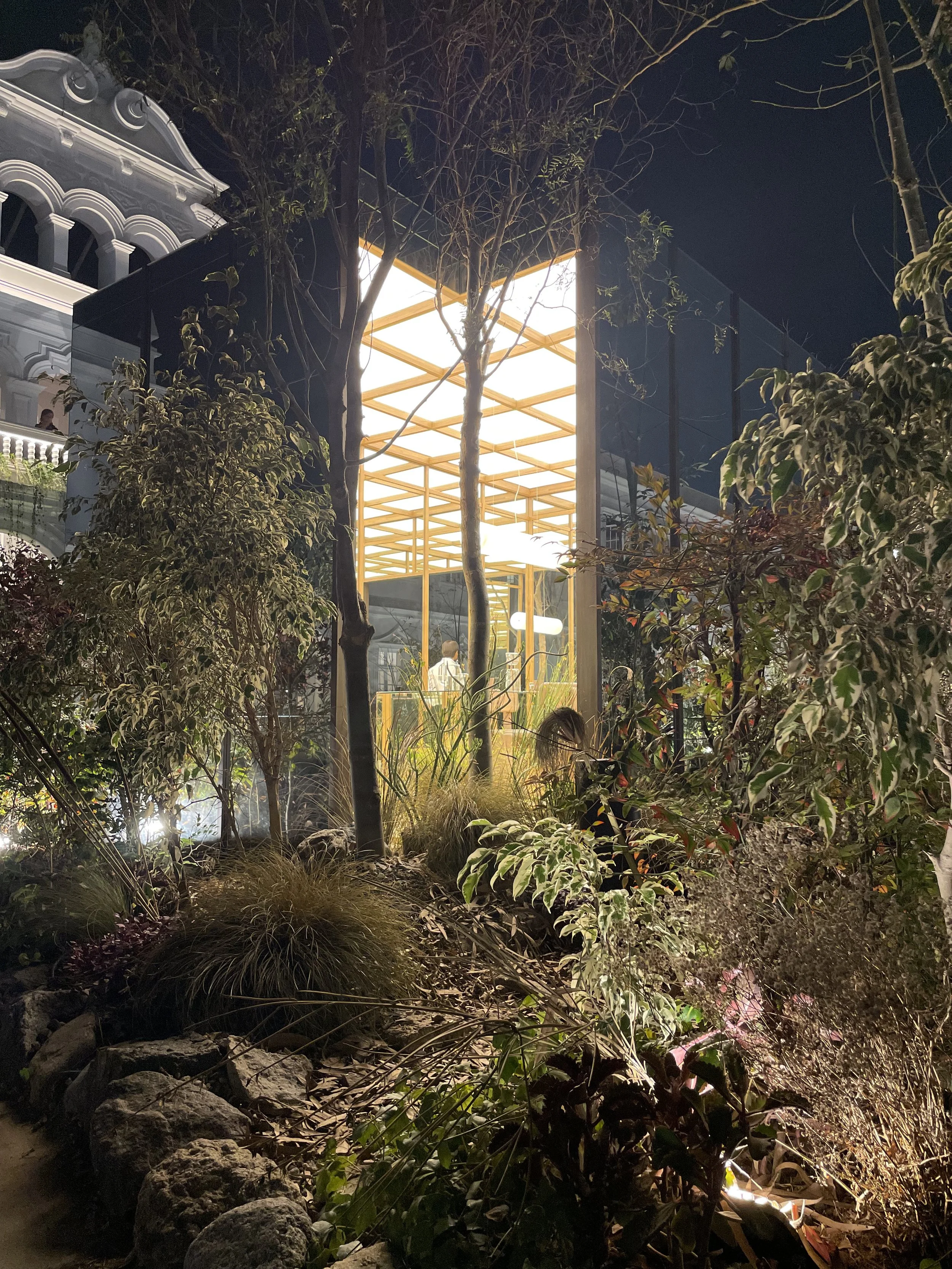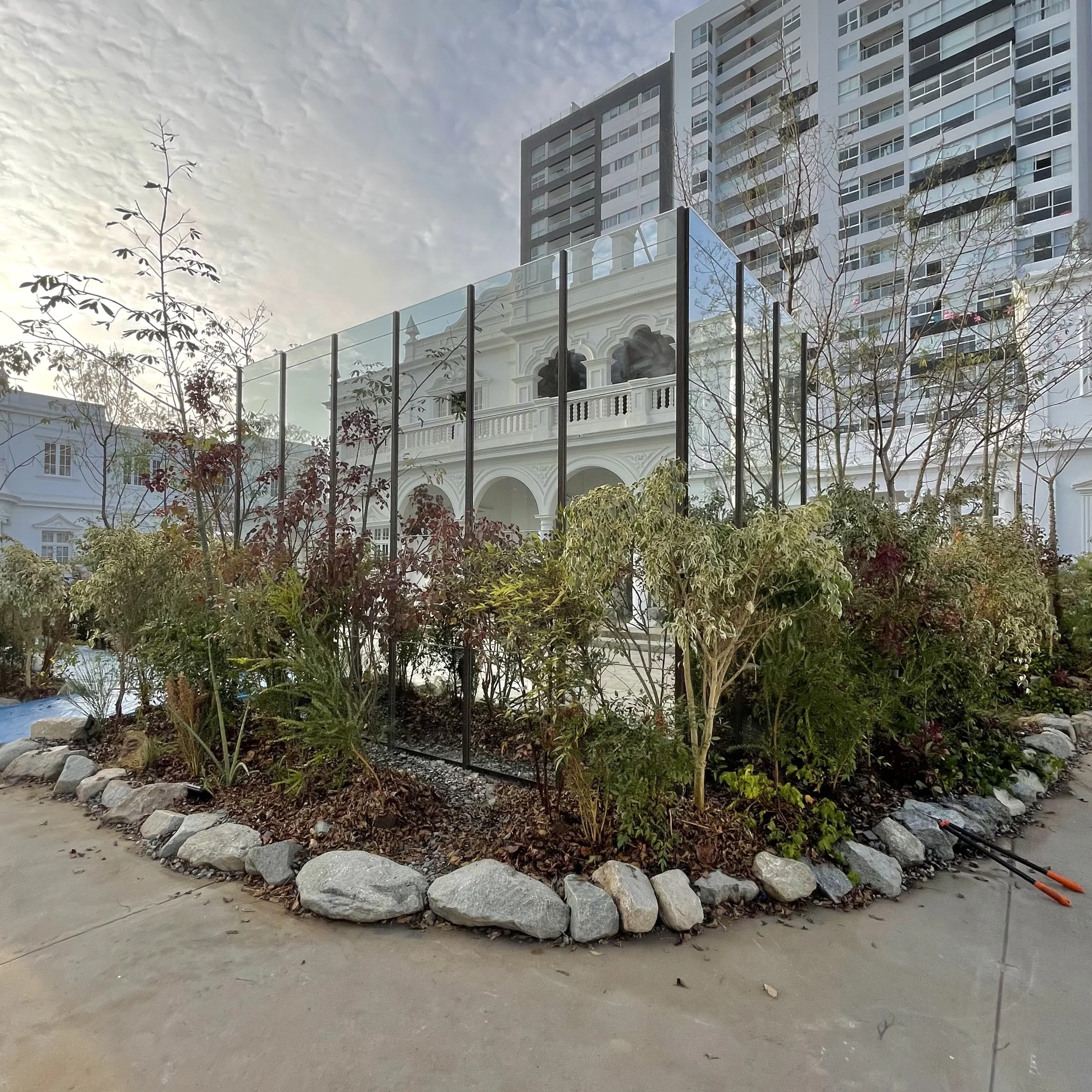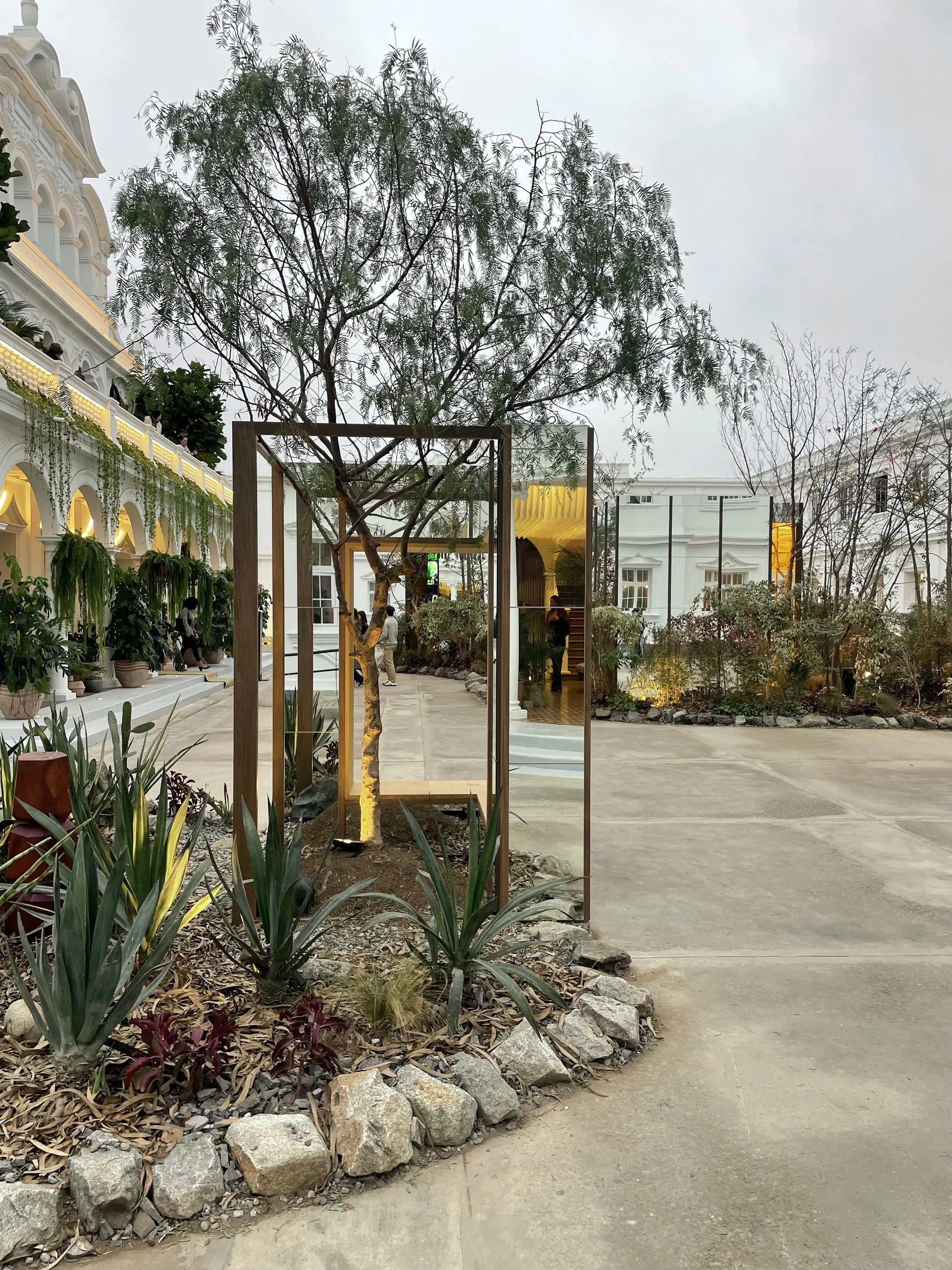 Allá propuso para CasaCor Lima 2024 un espacio que opera como ecosistema antes que como instalación: estructuras de madera certificada que organizan el territorio sin dominarlo, islas de vegetación que generan su propio microclima, agua distribuida con lógica hidrológica. El resultado no imita la naturaleza — la convoca.