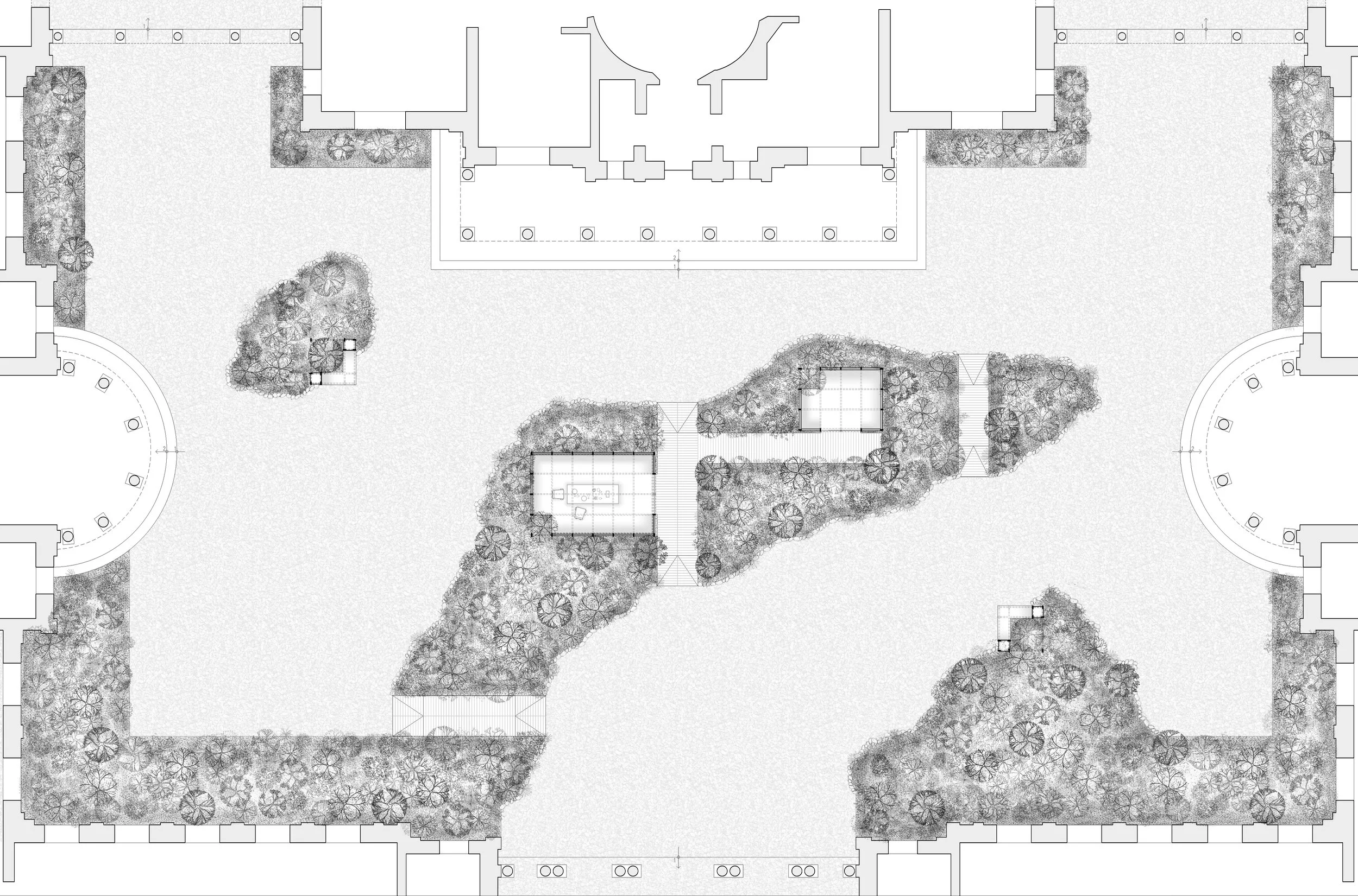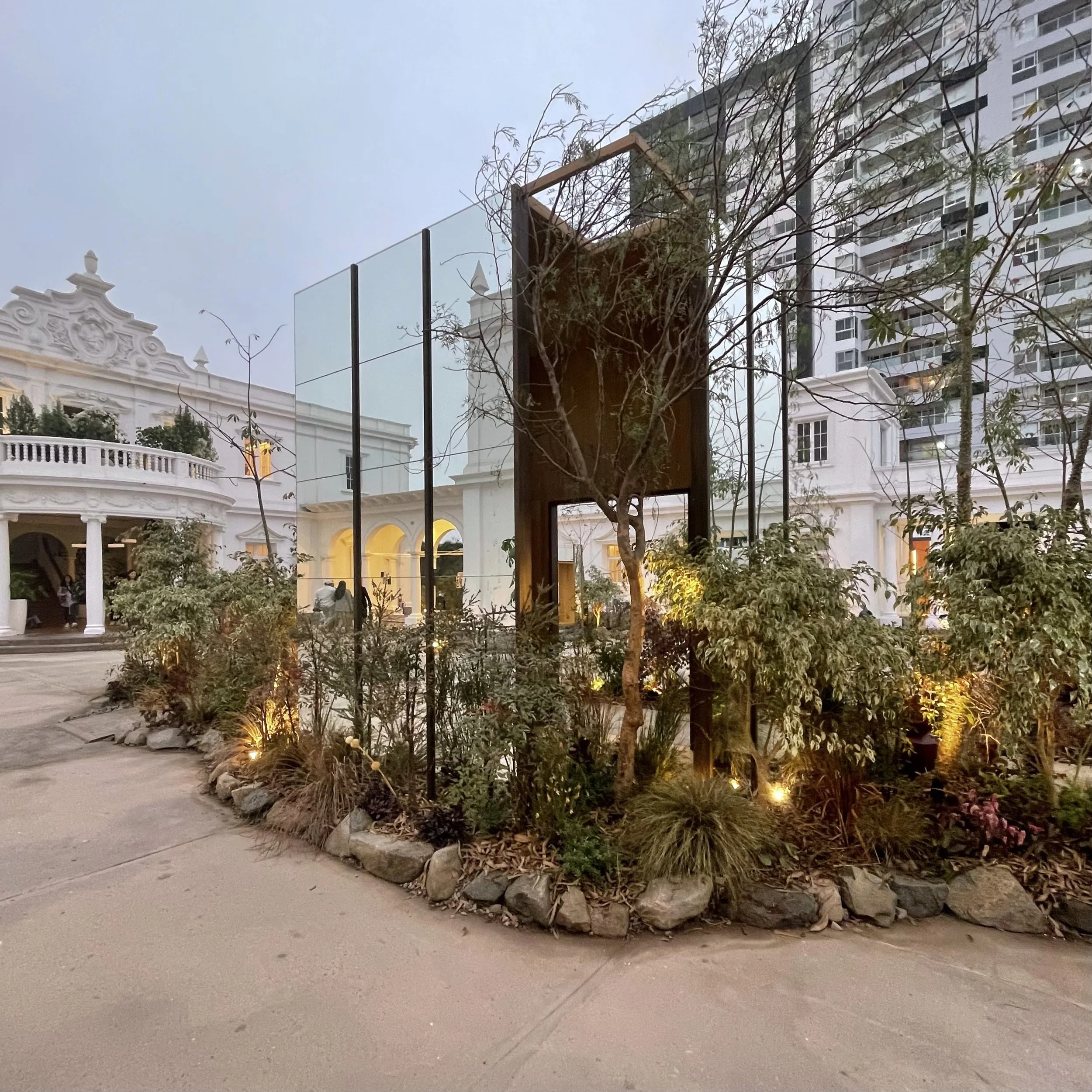 Estrategias técnicas Material reciclado en los volúmenes de vegetación · Diversidad de especies calculada por eficiencia ecológica · Gestión activa del recurso hídrico · Madera de origen certificado · Diseño modular para reutilización futura