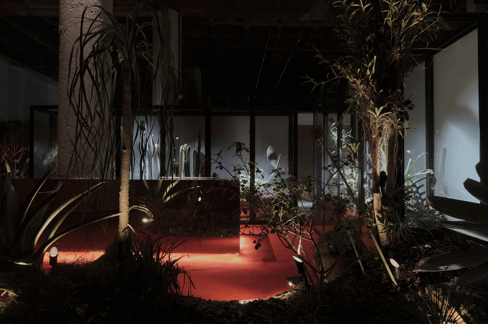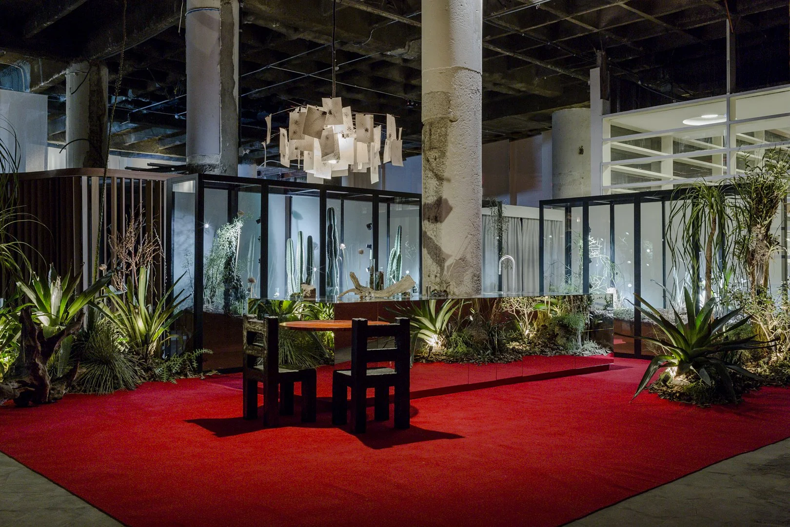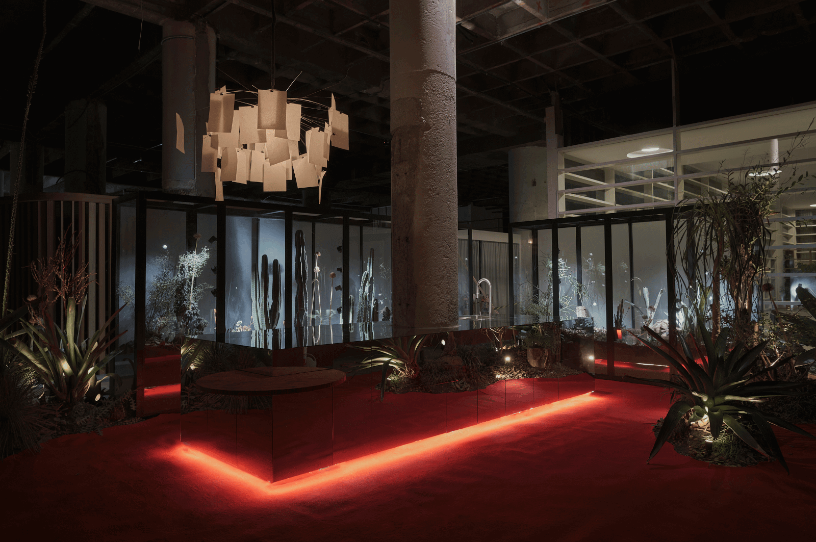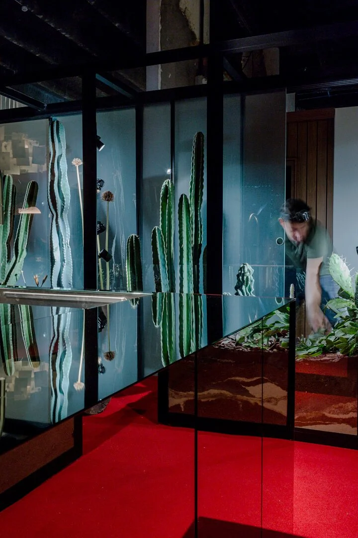 Los protagonistas son el Mandacarú — el cactus columnar del nordeste brasileño, capaz de sobrevivir donde casi nada puede — y las bromelias gigantes de Brasil, organismos que acumulan agua en sus propias estructuras, autónomos y soberanos. Ambos habitan grandes vitrinas de vidrio, terrarios 85% herméticos que reducen el consumo hídrico en un 70%. No son escaparates: son microsistemas con lógica propia, indiferentes al espectador.