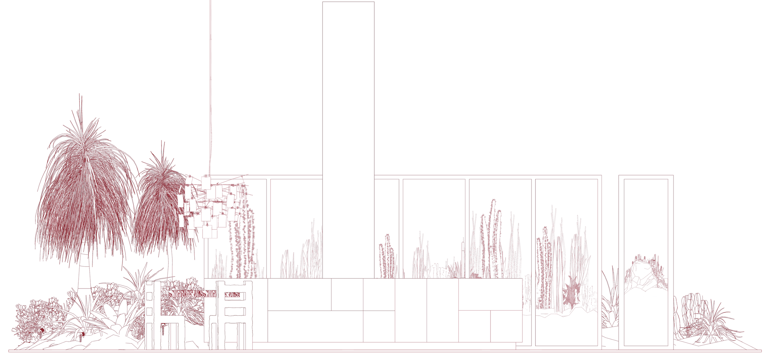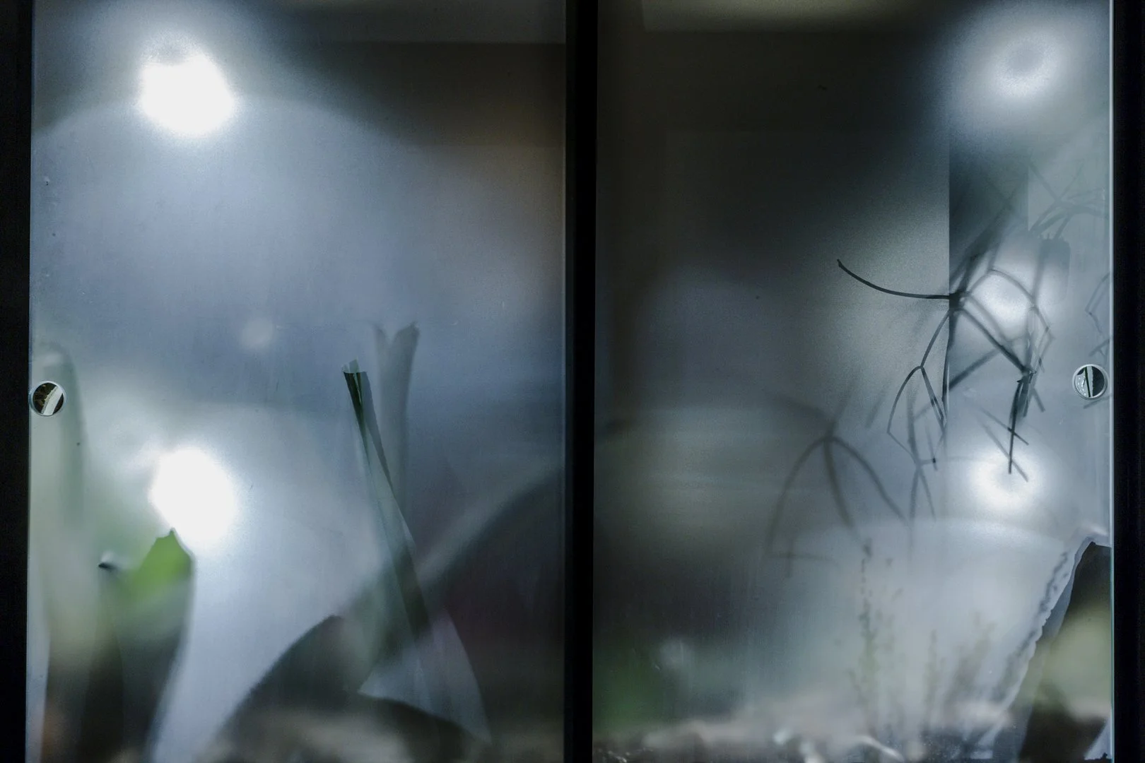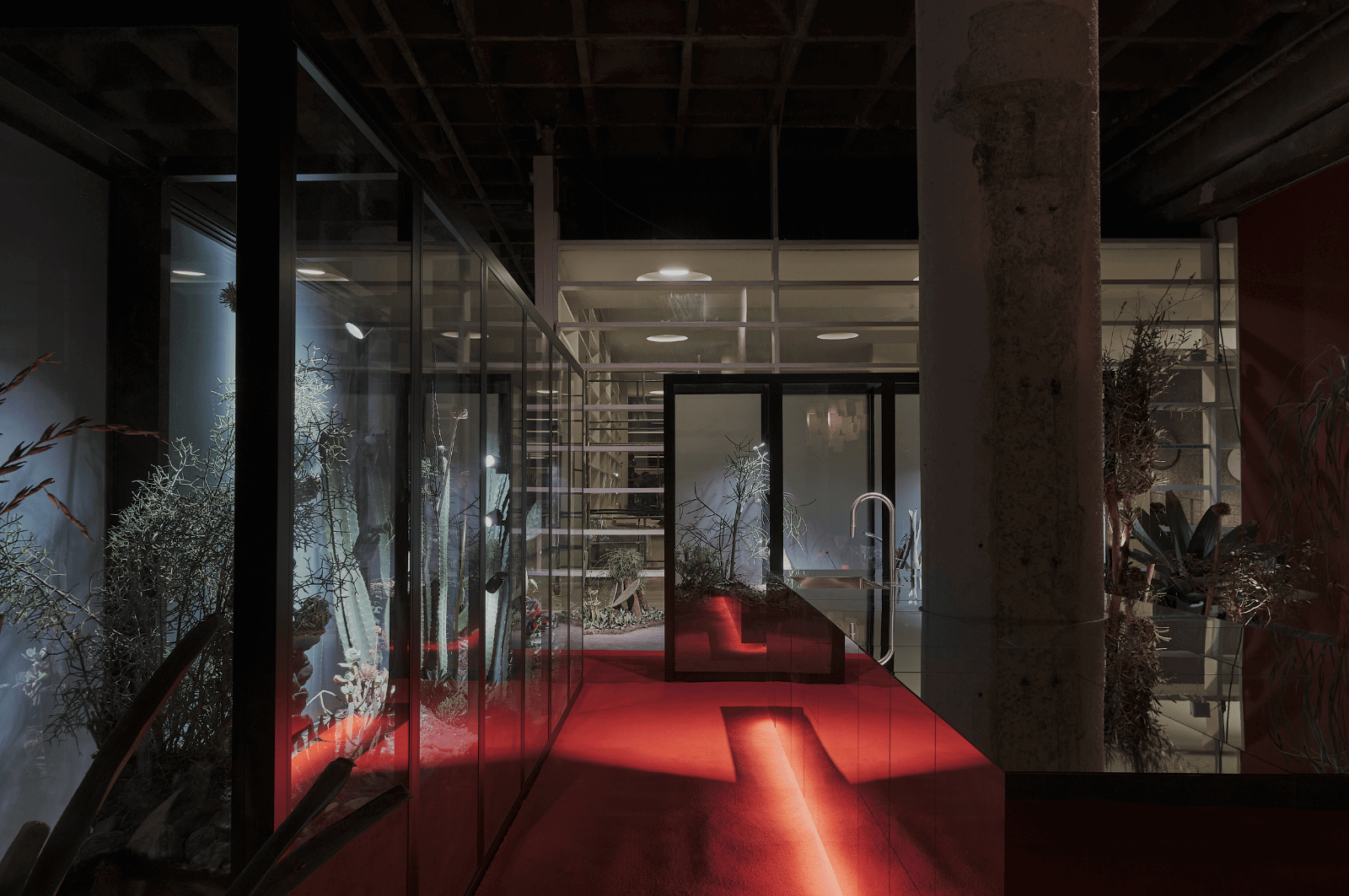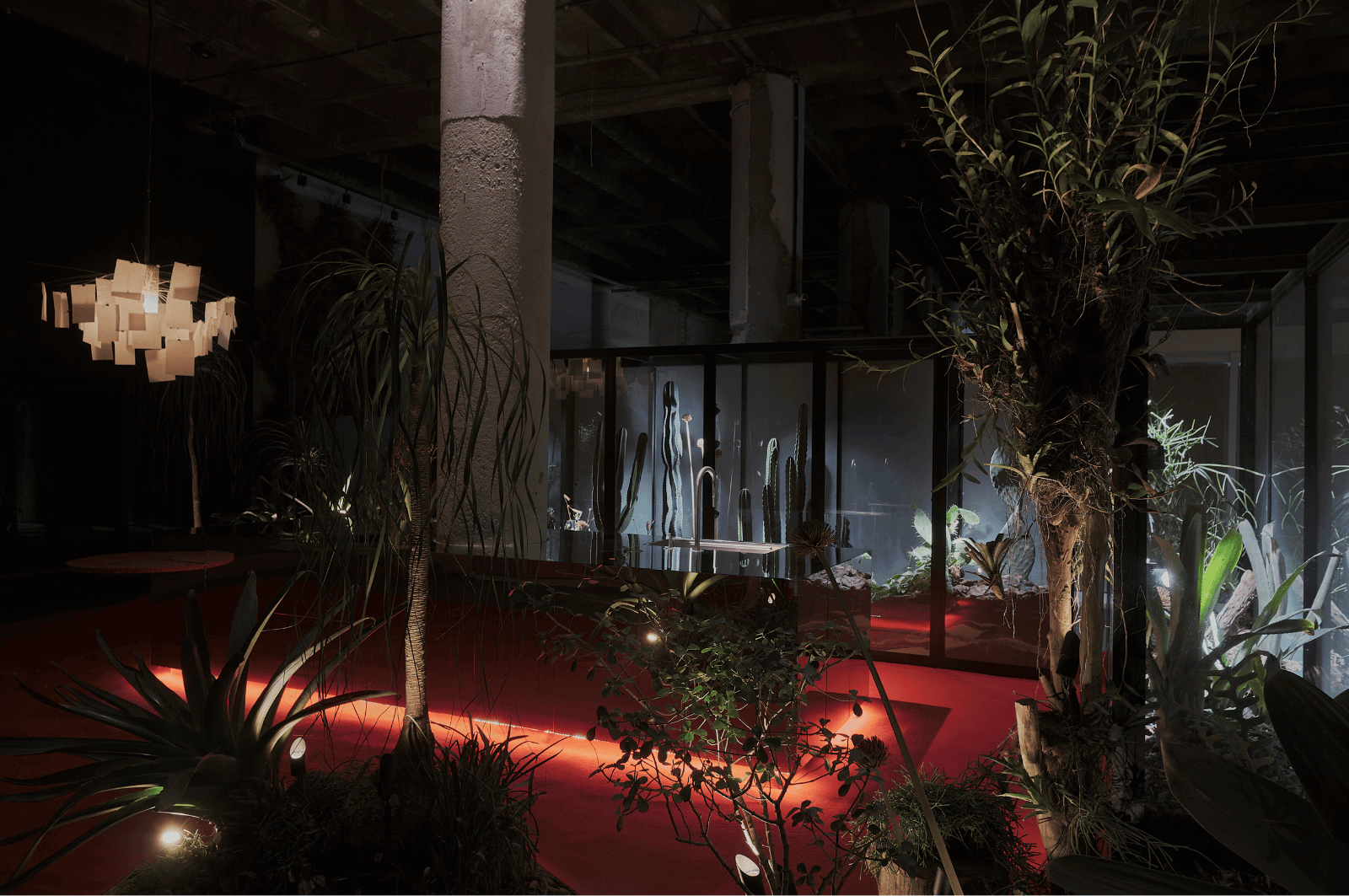 Los protagonistas son el Mandacarú — el cactus columnar del nordeste brasileño, capaz de sobrevivir donde casi nada puede — y las bromelias gigantes de Brasil, organismos que acumulan agua en sus propias estructuras, autónomos y soberanos. Ambos habitan grandes vitrinas de vidrio, terrarios 85% herméticos que reducen el consumo hídrico en un 70%. No son escaparates: son microsistemas con lógica propia, indiferentes al espectador.