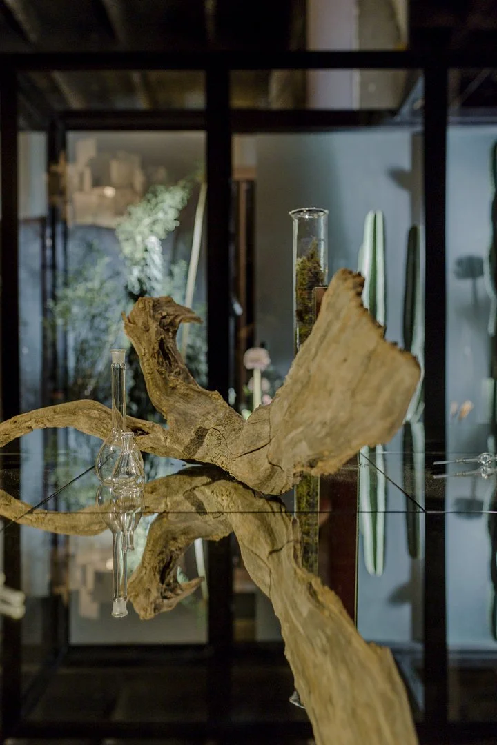 En el centro del espacio, un mostrador de espejos de diseño propio — con una mesa redonda enchapada según un patrón de Ettore Sottsass incrustada en su superficie — refleja el universo vegetal que lo rodea. El objeto no decora: colapsa la distancia entre quien mira y lo que crece. La iluminación, calculada con rigor científico y ejecutada con lámparas LED, no ambienta: evidencia.
